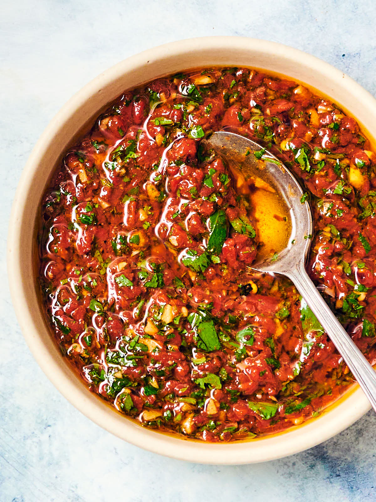 - Combine: To a food processor, add ½ cup roasted red pepper, ⅓ cup flat leaf parsley, 2 tablespoons cilantro, 2 tablespoons red wine vinegar, 2 cloves garlic, 1 teaspoon smoked paprika, ½ teaspoon cumin, ½ teaspoon fine sea salt, and ¼ teaspoon red pepper flakes. Pulse until red pepper is finely chopped but not pureed.