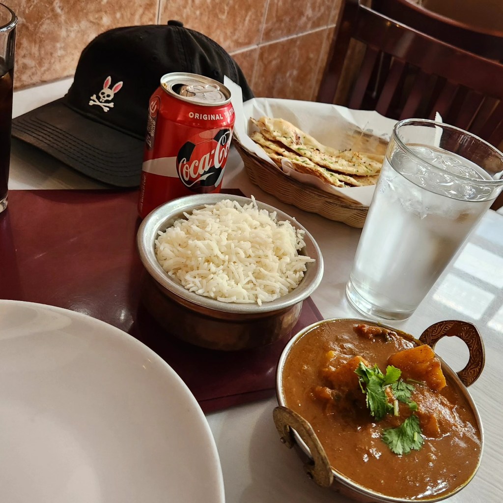 I have to say today, it may partially have been that I’ve been jonesing for some time, but today really met my expectation. The vindaloo sauce was perfect, absolutely delicious and spicy enough to make me sweat but not enough to vacate my sinuses. The chicken was was fall apart tender, the potatoes firm but able to be cut with a fork. Perfectly cooked basmati rice and of course a Coke is a Coke. The biggest joy was the best garlic naan I’ve ever had. Really spectacular naan is soft and fluffy at the edges and nearly crunchy toward the middle. And a lot of places miss on the level of garlic, either barely tasteable or overpowering. This was absolutely perfect, soft and fluffy edges, crisp in the middle, you could taste the garlic but it wasn’t too much. It’s been a while since I’ve had a meal that so perfectly met my hopes and expectations, so today was a very happy day.
