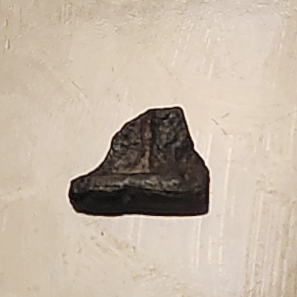 On day three the weather turned cold and windy with some rain. So the beach combing changed a bit, no more sun burn and fewer people on the beach. And something fortuitous had happened the day before. I’d gone to buy some souvenirs for my little nieces and nephews and bought them some shark tooth necklaces. In doing so it made me realize something, my search image had been a bit off, I was searching for teeth at too large of a size. So I started looking smaller and on day three, freezing my ass off, I finally found my first tooth, not quite the prize I was hoping for, it’s point was broken off but there it was my first, millions of year old fossilized shark’s tooth. The photo at the head of the post is off the web, this below is my prize although it’s a bad picture.