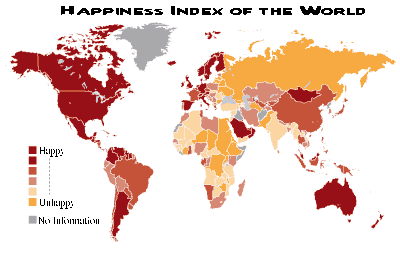 A color coded map of happiness worldwide and a lot of data and detail underneath