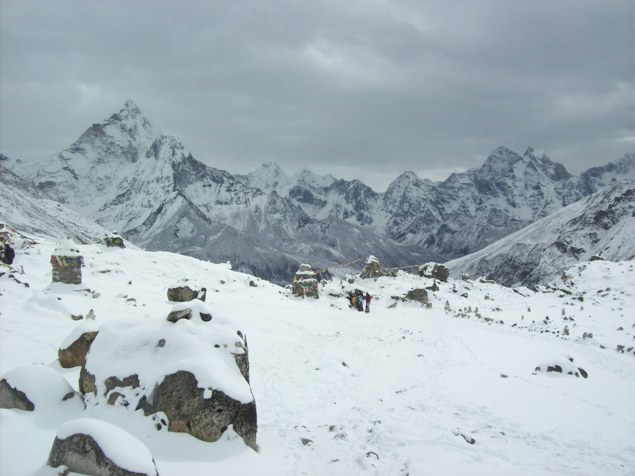 Retracing the steps we had done two days before we came to the ridge above Thugla and to the chortens marking the lost climbers. It had been magnificent and somber a few days before, but now it had taken on utterly surreal quality in the snow.