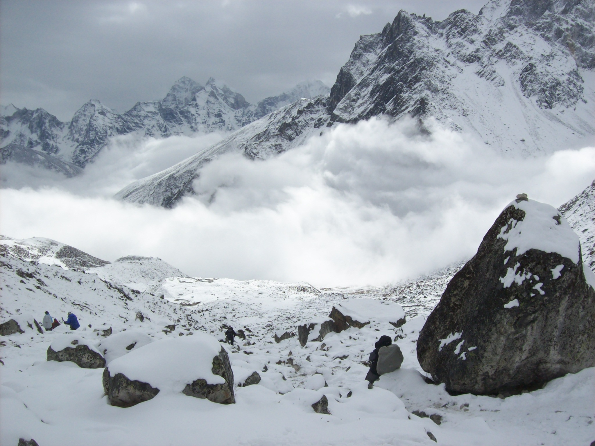 Once the decision was made we packed quickly and got ready to move. It was a brand new experience, walking trails that we had done the day before, but now were covered with snow and ice. The snow wasn’t terribly deep and we were making very good time considering the conditions. We flew the two hours down to Lobuche and the pace was frankly too much for me. Even going downhill at almost 17,000 ft the altitude can get to you, I was never so excited for a cup of tea as I was arriving at Lobuche that day in the snow. I had been nauseous most of the morning and now was dizzy on top of it, I hadn’t eaten much at all, but it was time to go back out in the snow