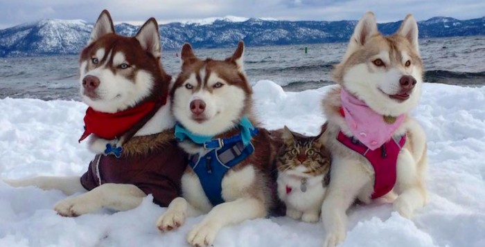 Cat rescued by 3 Huskies made part of the pack
