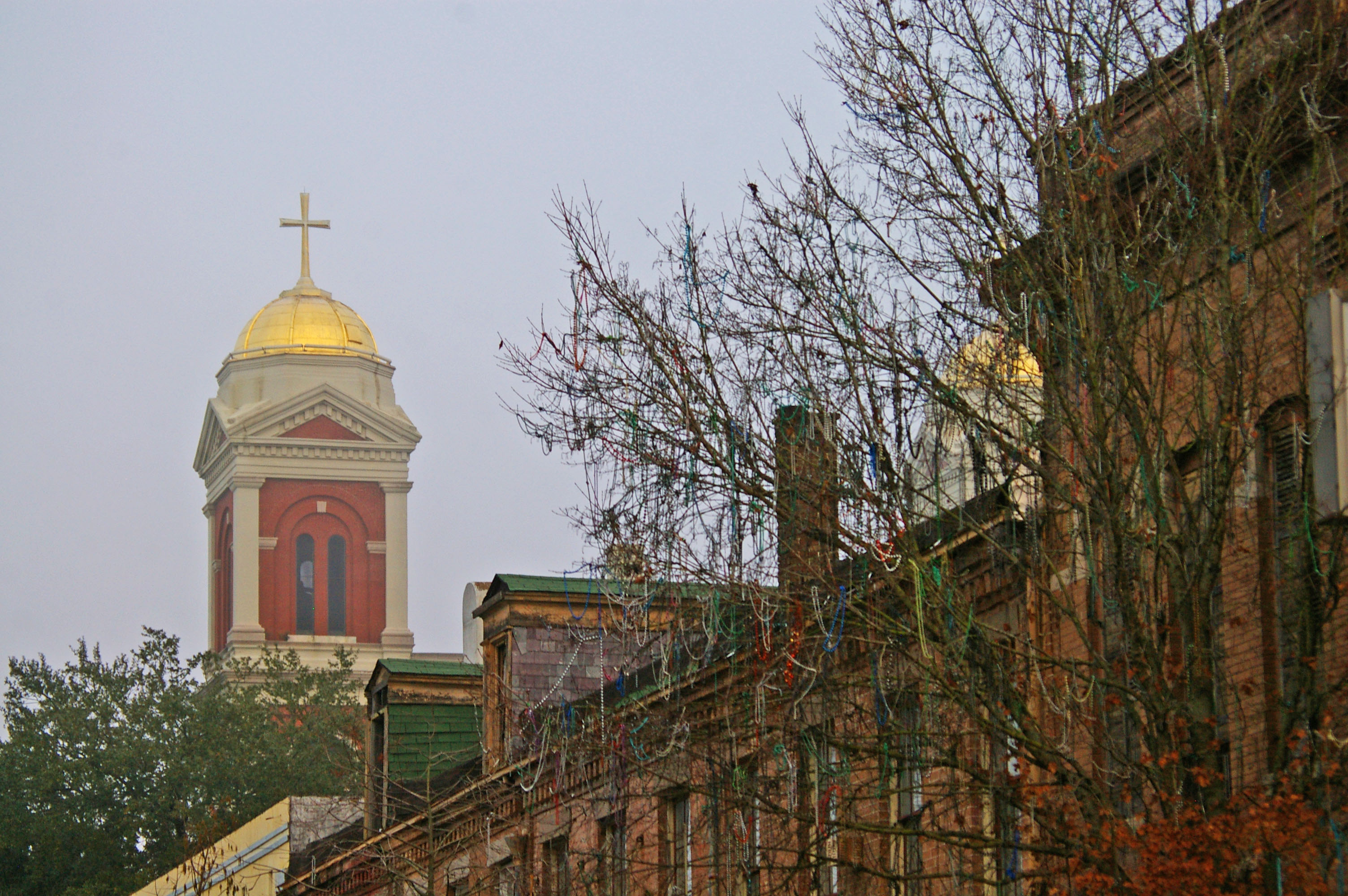 My favorite shot of the trip to Mobile, looked up crossing the street, the sun had been behind the clouds the whole day and bam, there it was, peaking through between the church and the bead tree, some time it is better to be lucky than good.