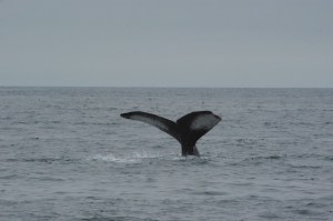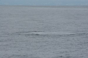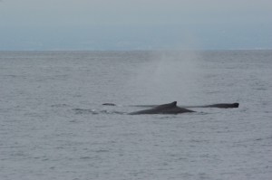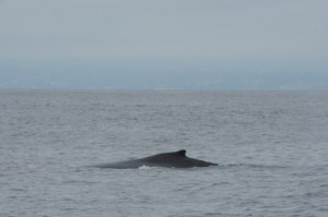 Whale watching like any nature related activity requires patience, and it was certainly tested on this trip. What was supposed to be a two hour trip started to get tentative once we were a full hour and fifteen minutes into the trip and still heading out away from the coast. It was a wonderfully flat day on the sea with some cloud cover and the temperature was nice. Everything was great, just no whales. We did see a couple of harbor porpoises but nothing else. It started to seem like we would end up turning around and seeing nothing when someone yelled two o’clock. There off the starboard bow were a couple of humpback whale blows. It would turn out to be four animals and we would get about a half an hour of observation as we followed them around.