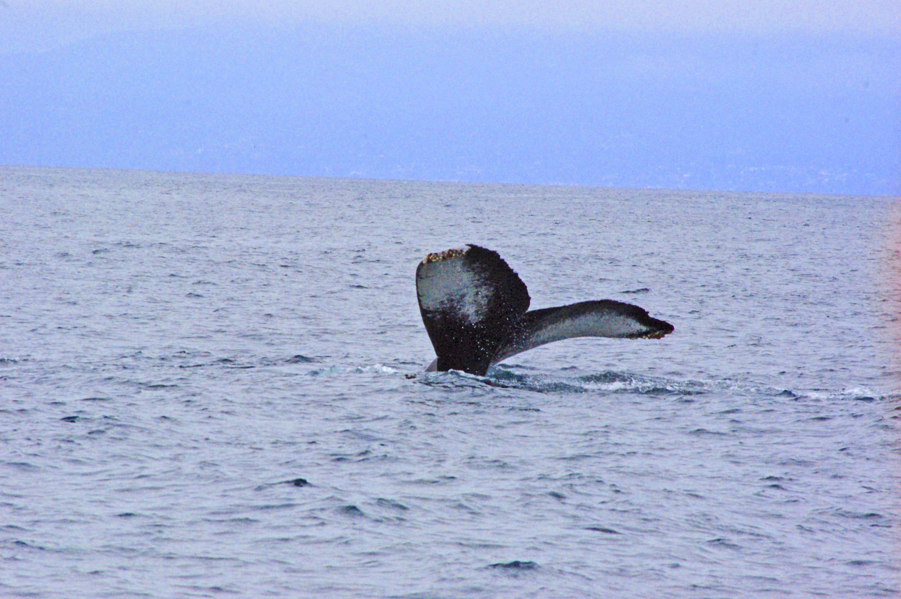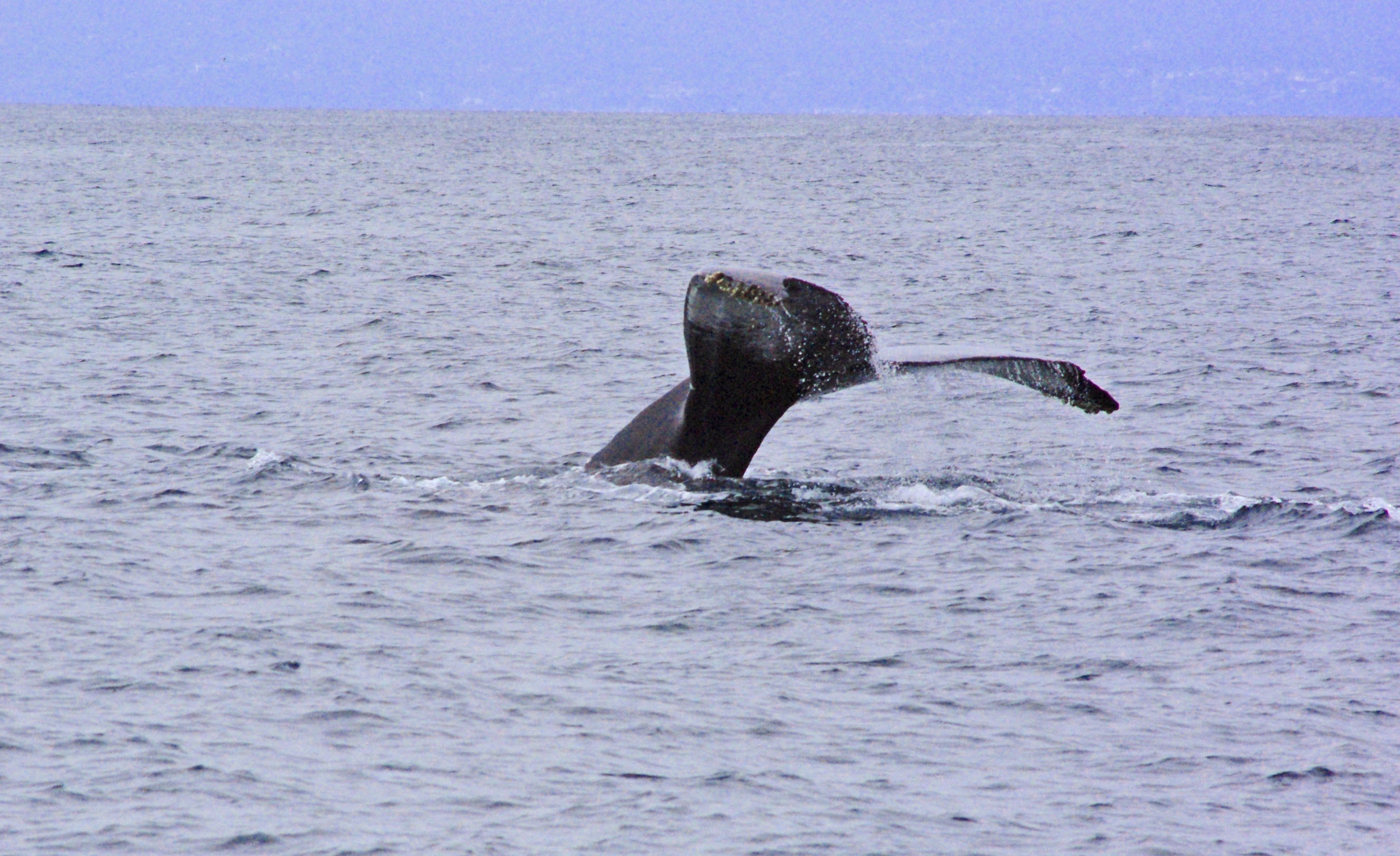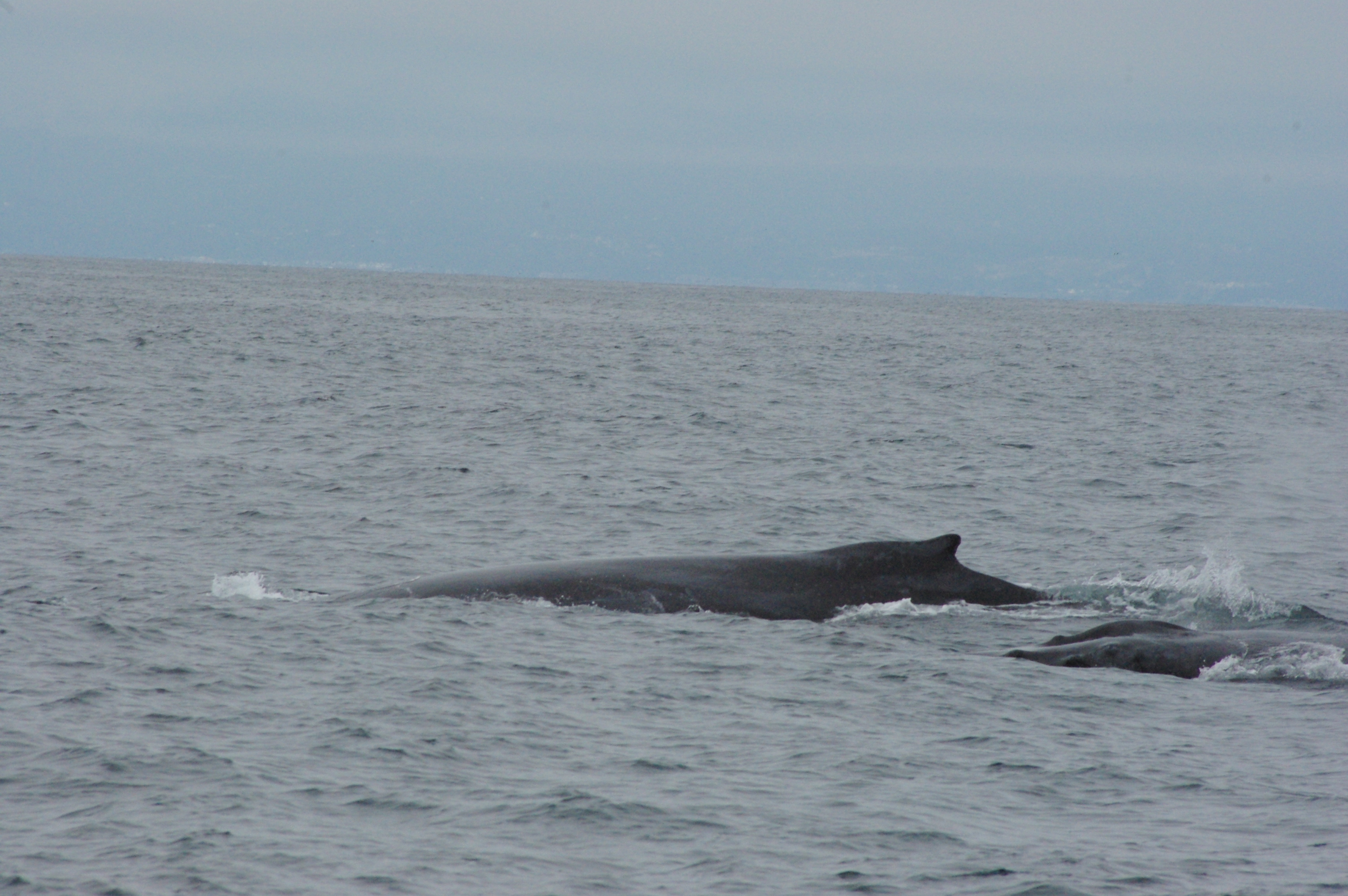Whale watching like any nature related activity requires patience, and it was certainly tested on this trip. What was supposed to be a two hour trip started to get tentative once we were a full hour and fifteen minutes into the trip and still heading out away from the coast. It was a wonderfully flat day on the sea with some cloud cover and the temperature was nice. Everything was great, just no whales. We did see a couple of harbor porpoises but nothing else. It started to seem like we would end up turning around and seeing nothing when someone yelled two o’clock. There off the starboard bow were a couple of humpback whale blows. It would turn out to be four animals and we would get about a half an hour of observation as we followed them around.