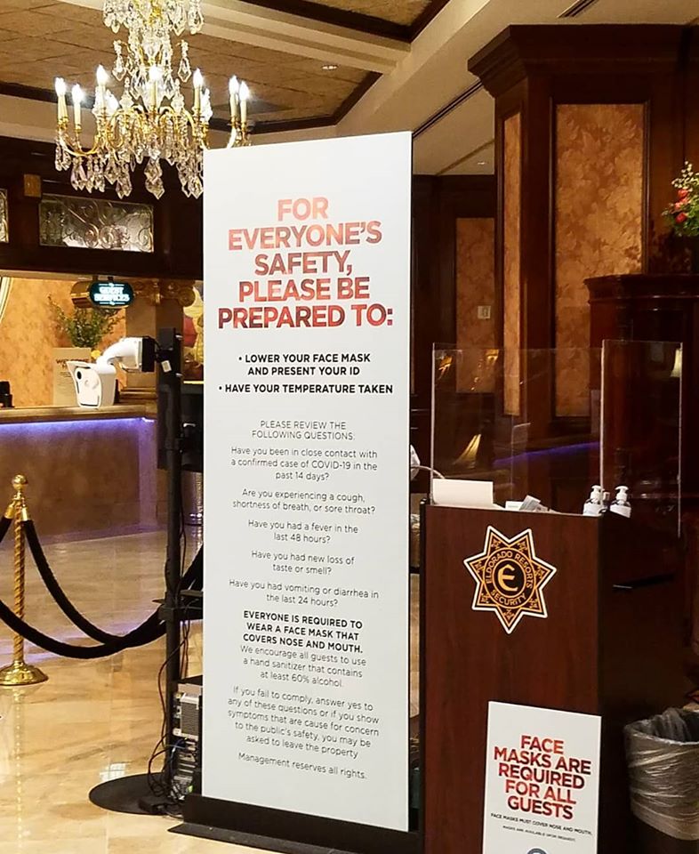 I definitely saw a little more frequent cleaning than normal, staff wiping down machines and railings. Being just after the Fourth of July holiday things were pretty quiet. But that also meant a lot of the restaurants weren’t open, there was no entertainment. So for meals I did local takeout and that worked fine except when I walked out to a taqueria across the street from the casino. On the way back I realized that they were controlling entry points as you could only re-enter through the valet or parking garage. It meant a bit of a walk but controlling entry with temperature checks would definitely work, however, as related above, I didn’t see any temperature checks occurring.
