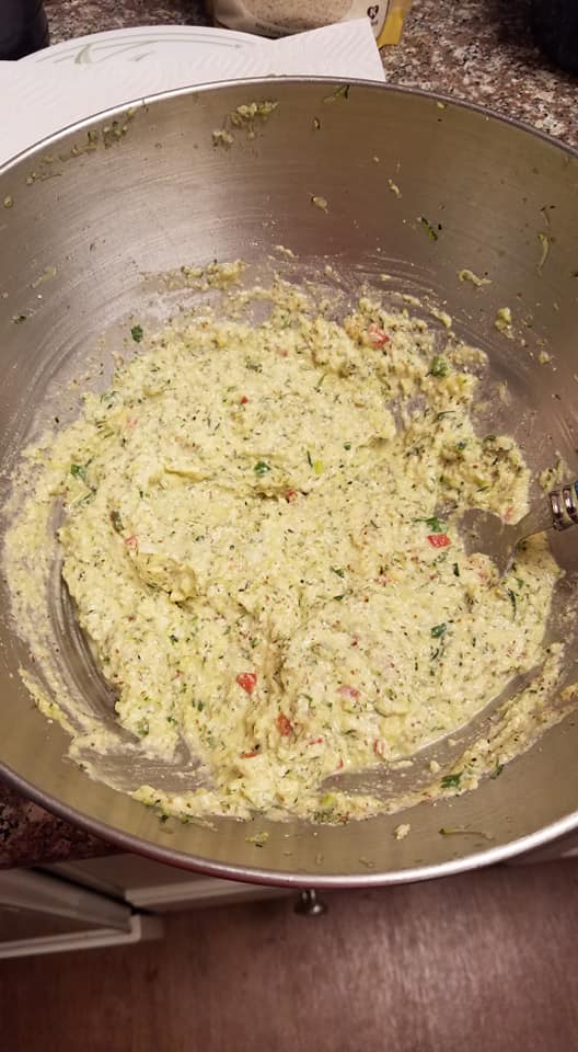 So here’s a little review of the process that I went through. First off, I rarely make a recipe as is. First, I found the recipe to be a little bit bland, so I decided to add some things to spice it up. So in addition to the shredded zucchini, I also added minced red bell peppers, scallions, garlic and some jalapeno peppers. I also used liquid eggs instead of whole eggs, for me that works better if you have to adjust amounts and turned out to be a good thing with this recipe. Here’s what the batter looked like: