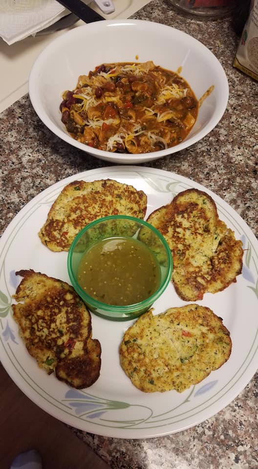 The first batch that I did had two deficiencies. First, they didn’t hold together very well, so I added more eggs and almond flour. Second, although good, they needed a little salt and pepper. So I decided to, once I dropped in the batter, salt and pepper each fritter and that worked very well, I just did it on the first side.