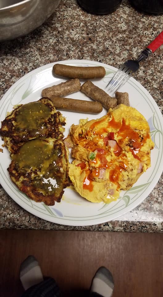This morning I enjoyed them with a veggie and cheese omelet and some sausage.