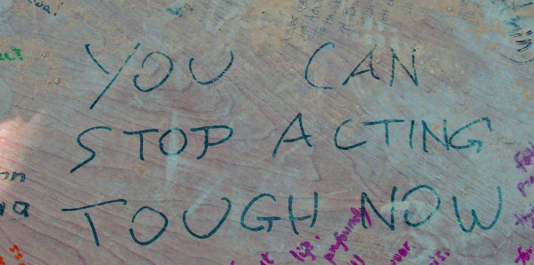So much of the time we act tough, we have to, other people depend on us. We act tough so others won’t be afraid, so our children won’t know how hard things truly are when they are bad. We act tough because we know we are strong enough to handle things when others around us are not. But when it’s quiet, when you’re with others who truly care about you, stop acting tough. I know it feels like it, but you don’t always have to be the responsible one, the strong one, the tough one. Just stop at least for a minute and let others know you are vulnerable, that you hurt too, that sometimes you need to be cared for, not to be the one doing the caring. Understand my friends, you are deserving of the care you give others, it, whatever it is, is not your fault, so stop acting so tough and let someone care for you.