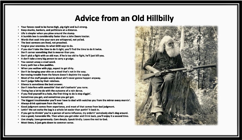 My favorite bit of advice, for obvious reasons is Don’t pick a fight with an old man, if he’s too old to fight, he might just kill you. I think I have a new poster for my office.