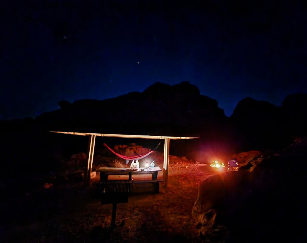 The pattern that happens in Valley of Fire State Park at least during the Christmas holiday works perfectly with the way I camp. The park, being so close to Vegas, starts to fill up at about 11AM and gets crowded around 3 or 4 PM. Typically when camping I’m up early, I like to get out and hike early and so most days I was coming off trails about the time the crowds started coming in. After lunch I like to chill out and read, lay in my hammock and just chill out before making dinner and setting a fire for the night to sit by and look at the stars.