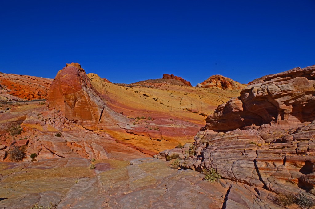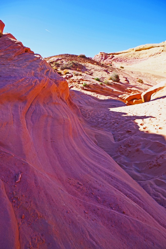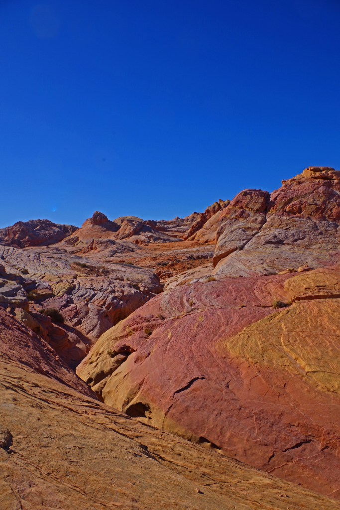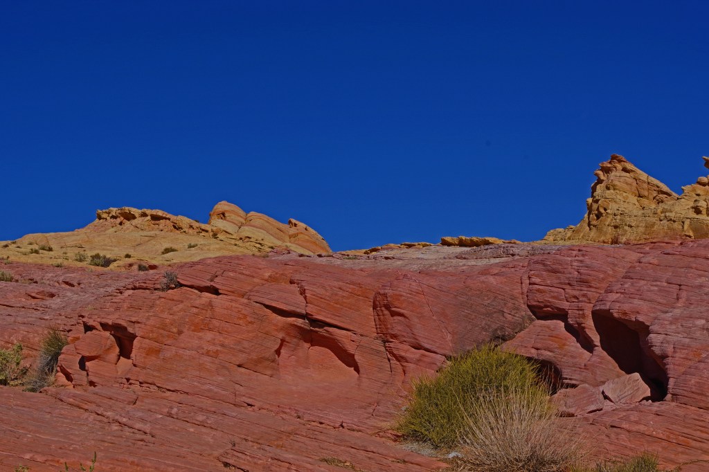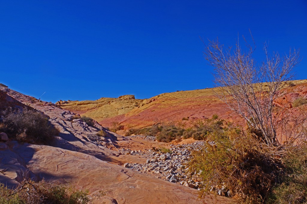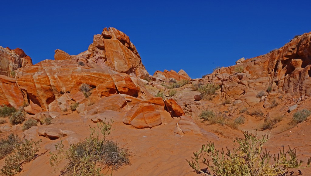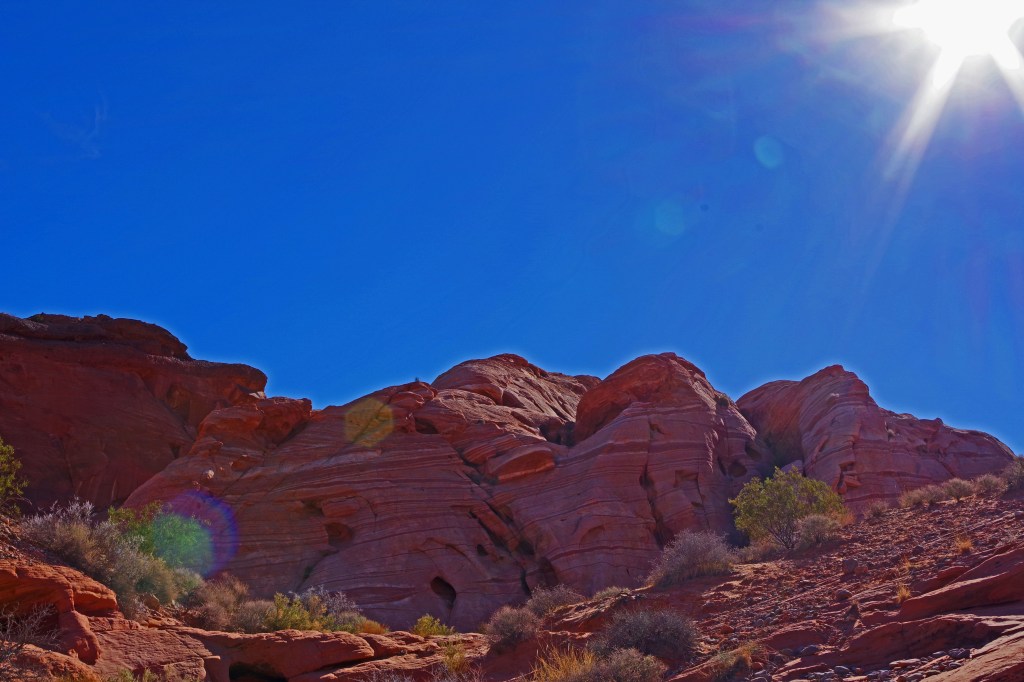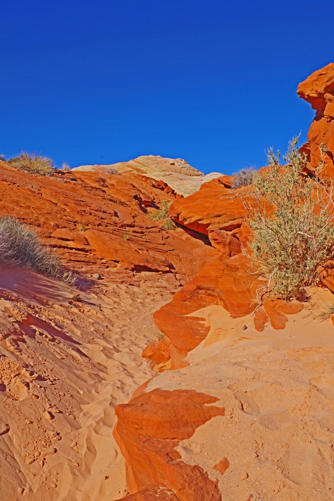 The one complaint that I have about Valley of Fire is that the hiking trails are terribly marked. I’m a very experienced hiker who has hiked literally all over the world. I got lost twice on very short tourist trails. There was never any danger, the trails were short and I could dead reckon my way back to the parking lots, but even when I was pretty far off trail there were lots of footprints. I wonder how many tourists with little experience end up badly sunburned, dehydrated or worse in the hotter months of the year.