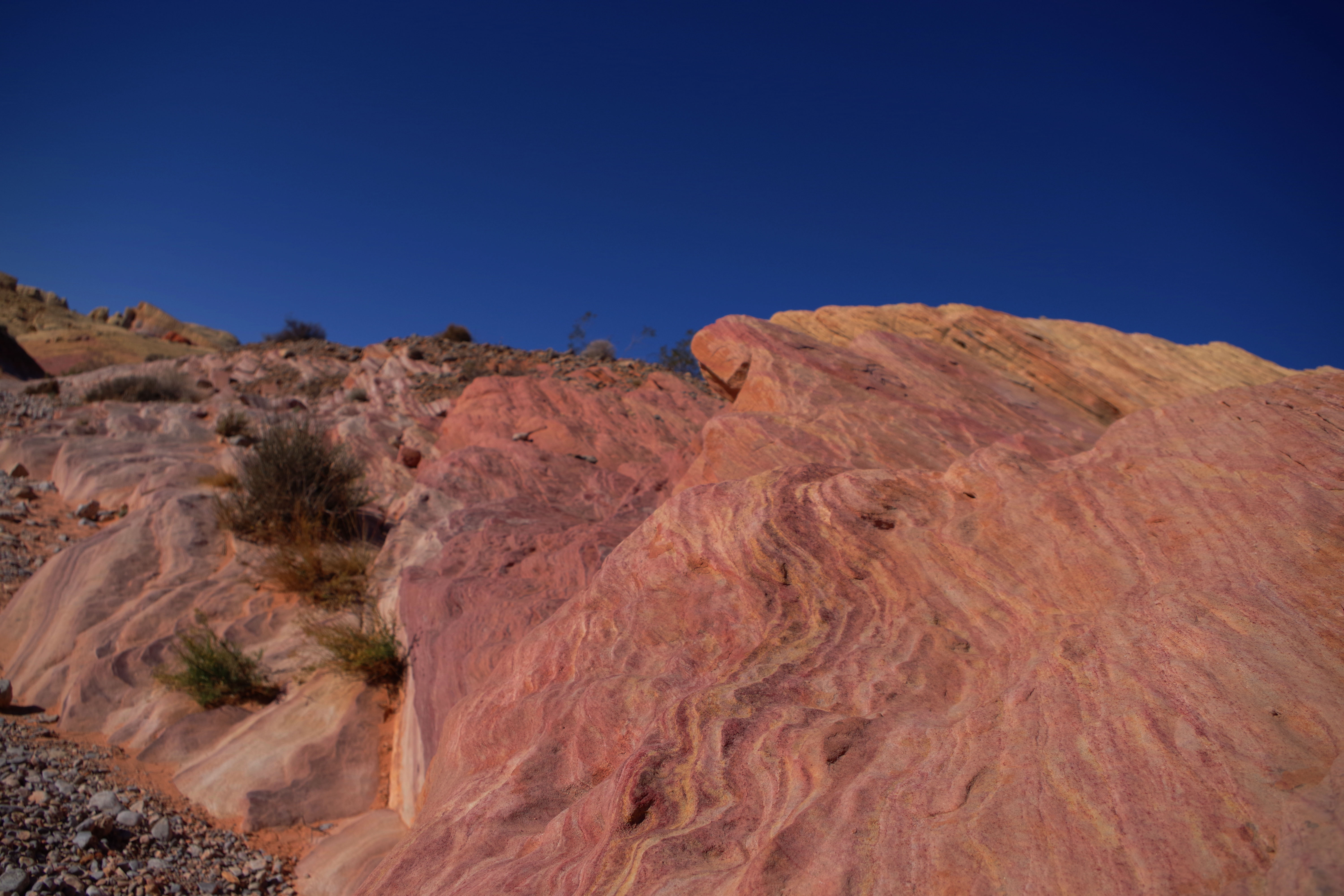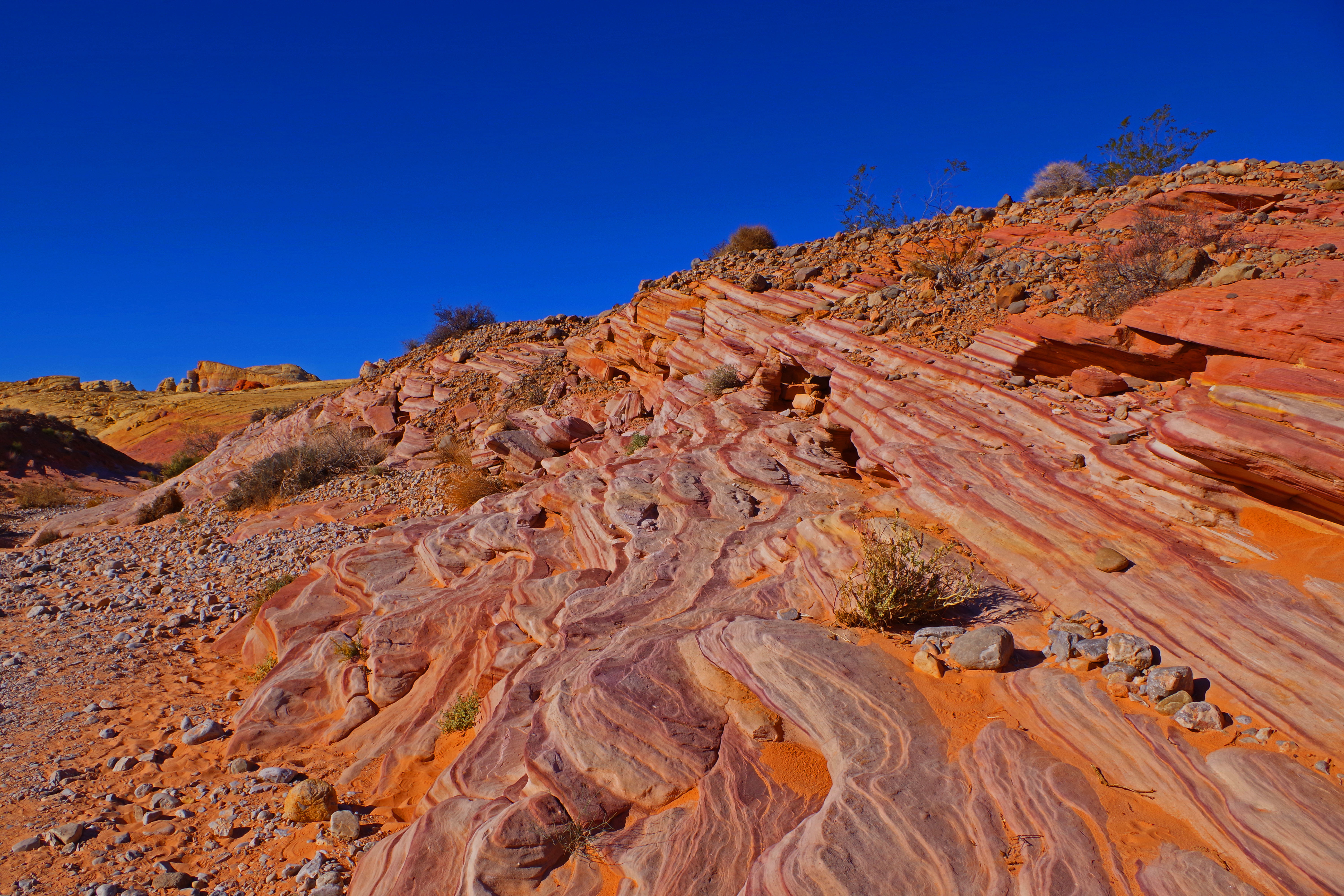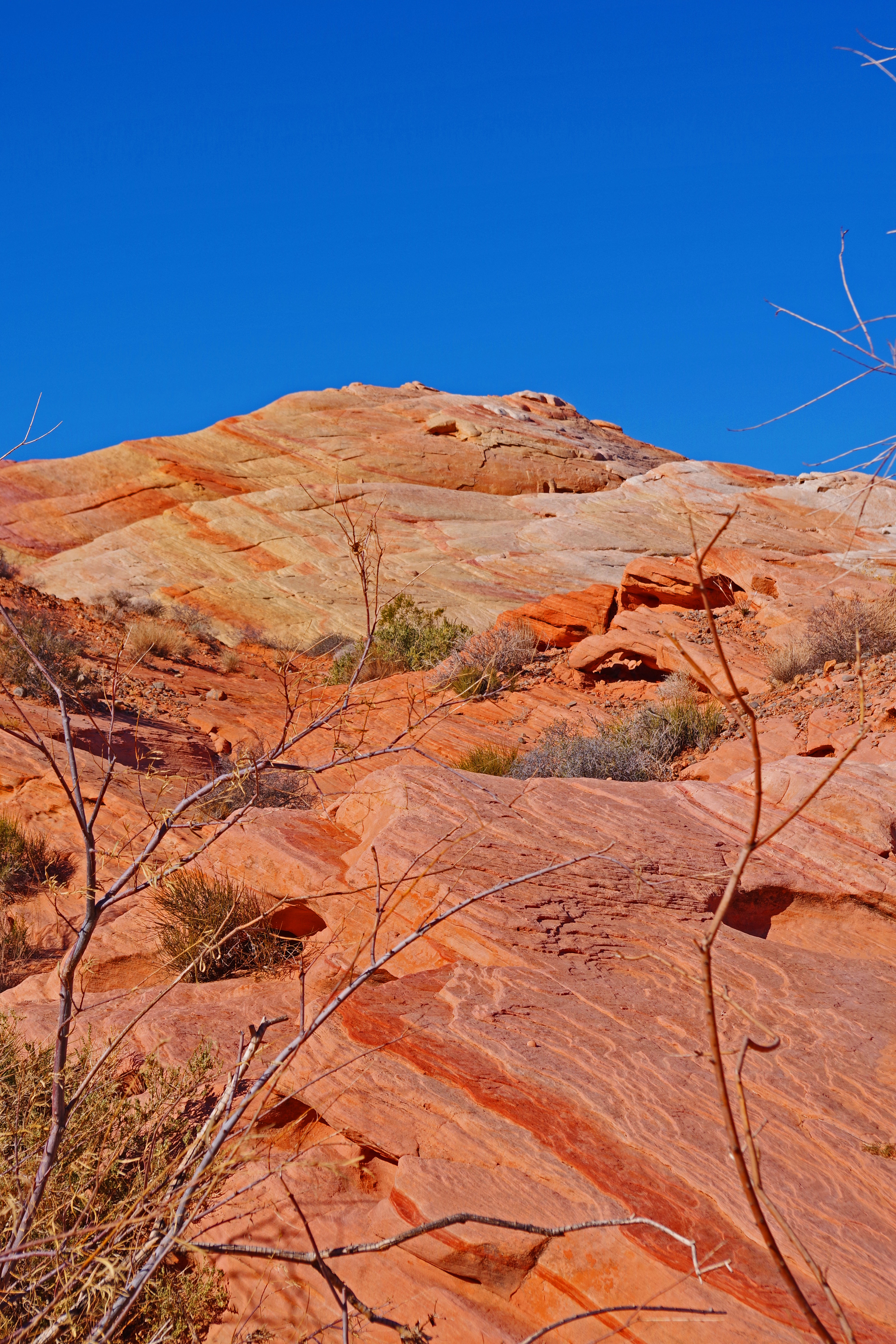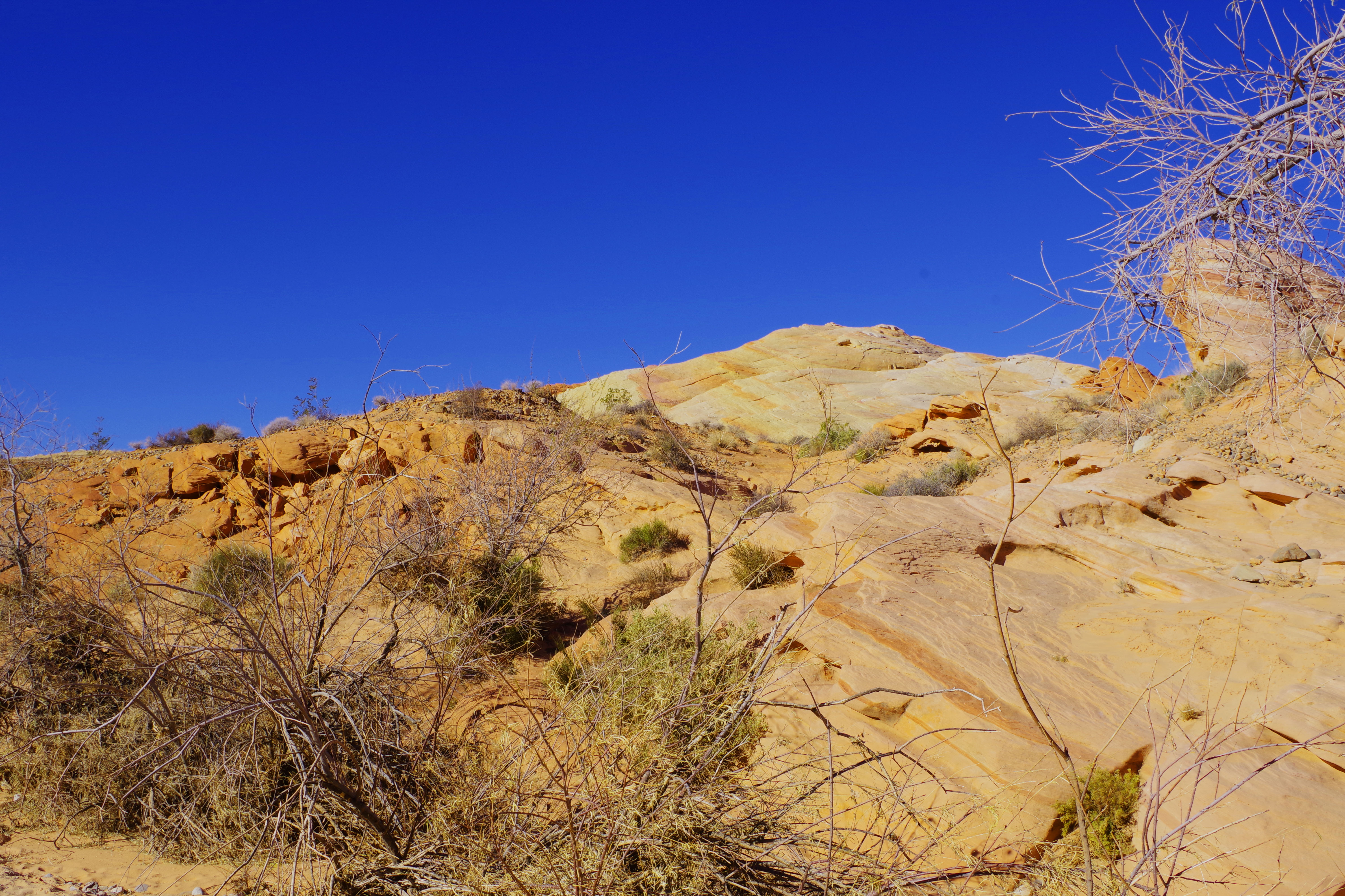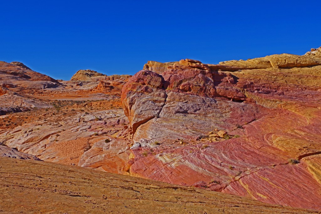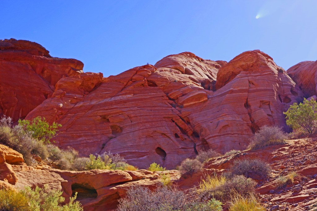 The one complaint that I have about Valley of Fire is that the hiking trails are terribly marked. I’m a very experienced hiker who has hiked literally all over the world. I got lost twice on very short tourist trails. There was never any danger, the trails were short and I could dead reckon my way back to the parking lots, but even when I was pretty far off trail there were lots of footprints. I wonder how many tourists with little experience end up badly sunburned, dehydrated or worse in the hotter months of the year.