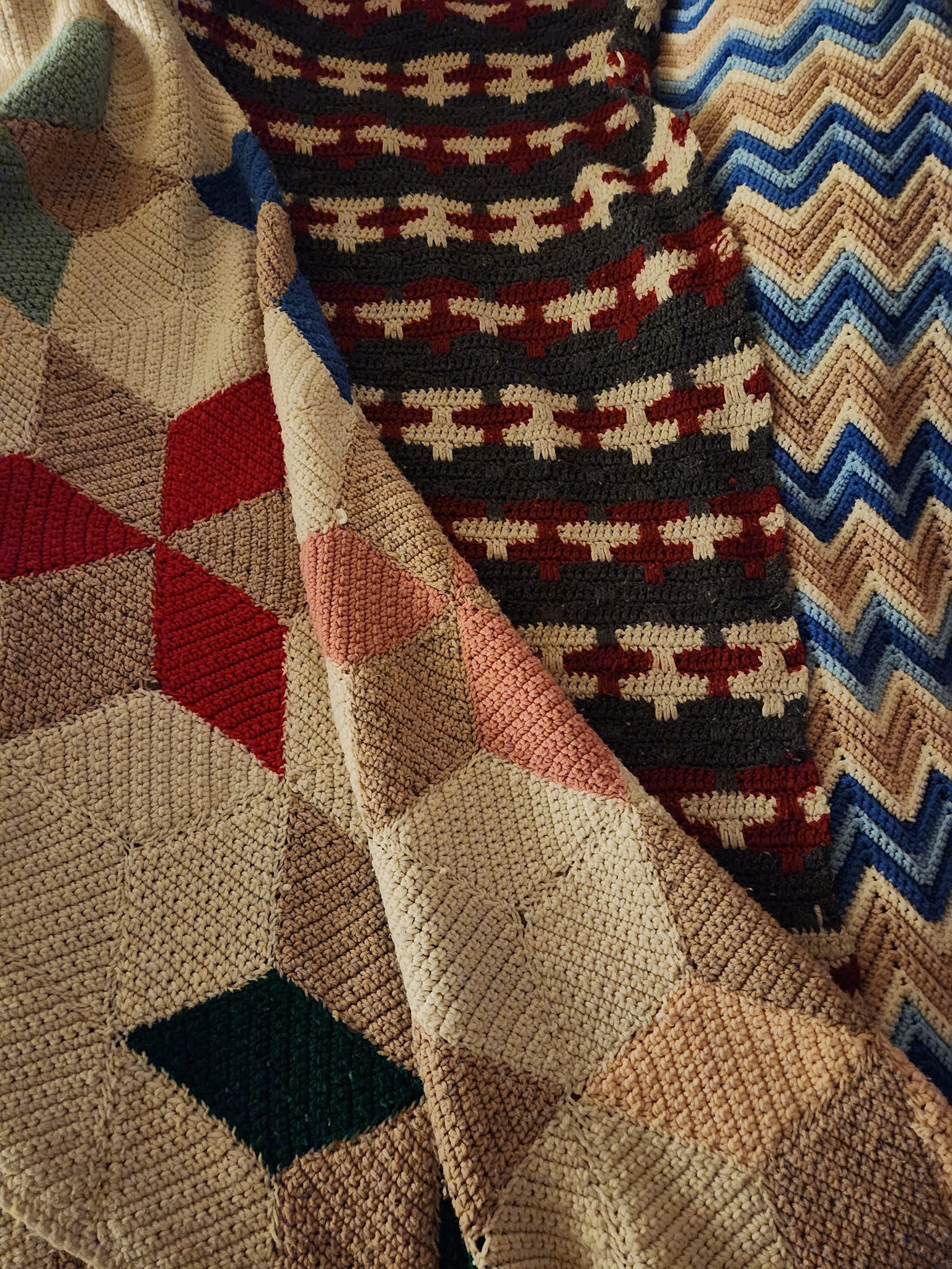 I have been blessed in my life to be surrounded by women who knit and crochet. As such, I’ve always had large numbers of homemade blankets at my disposal. The three pictured above are the ones the reside on my bed at night. The blue and white blanket was made by my mother years ago, the patterned blanket in the middle by someone who has been a student, a lover and an incredible friend, the white with diamond patterns on the left was made by my Granny.