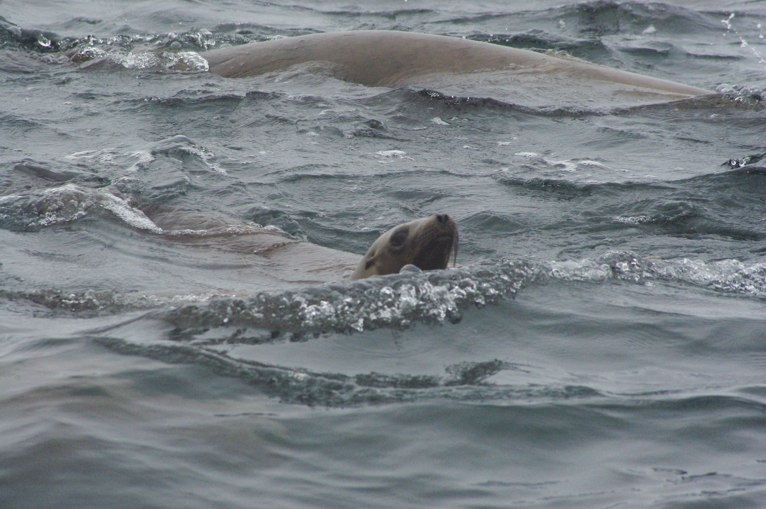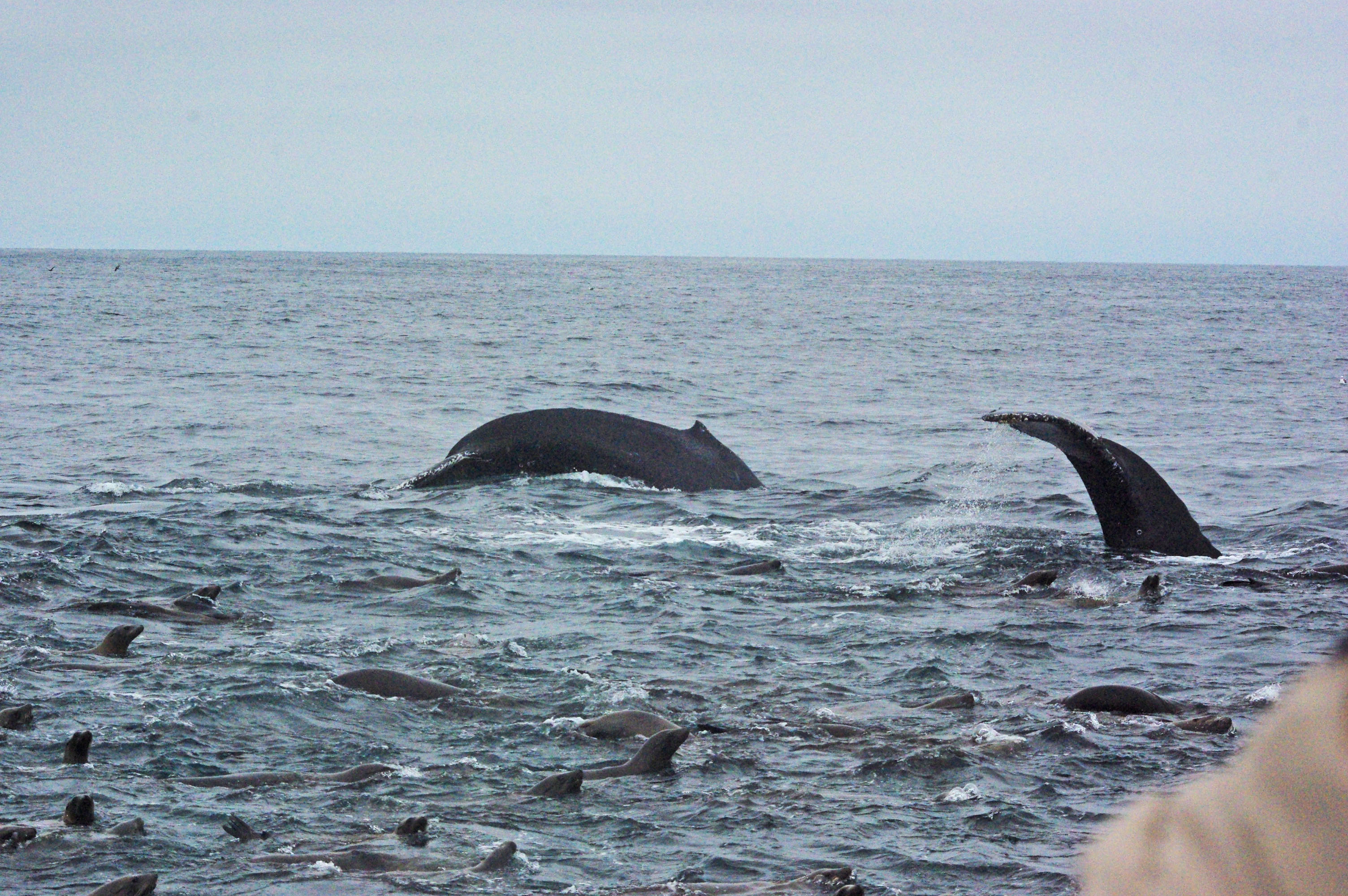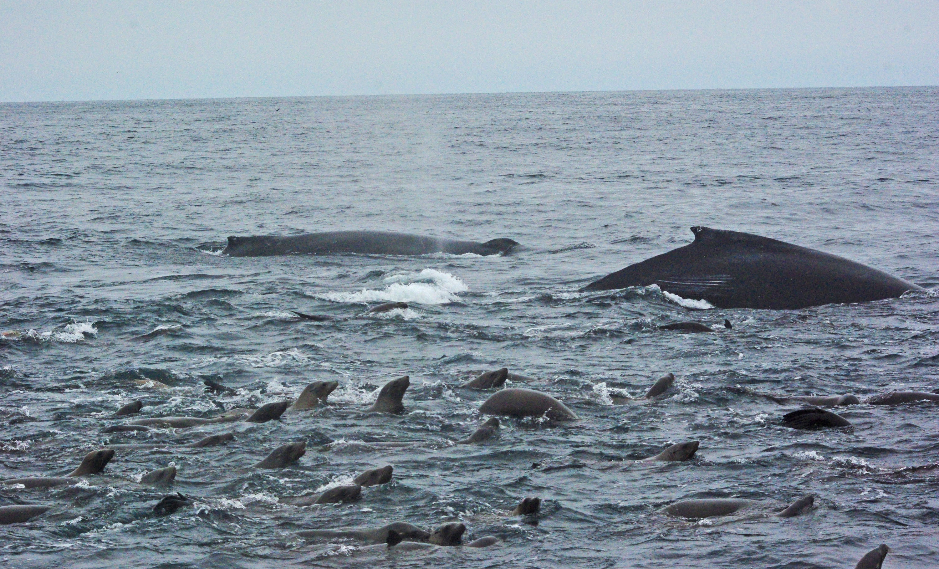 We then moved on to a couple of different groups of humpback whales and one group was particularly fun. They were obviously diving to feed and a full raft of about 200 sea lions were also chasing and feeding on the same bait ball. Both the whales and sea lions would dive at the same time, diving down and raiding the anchovy school. We’d know when and where the whales would come up as the sea lions would surface blowing and gasping for air right before the whales.