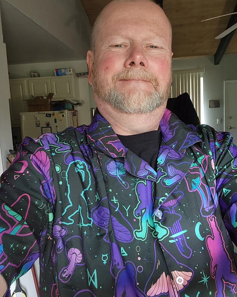 I got a new shirt, if you’re going to have to wear button up shirts during recovery, you absolutely should have a psychedelic bigfoot shirt.