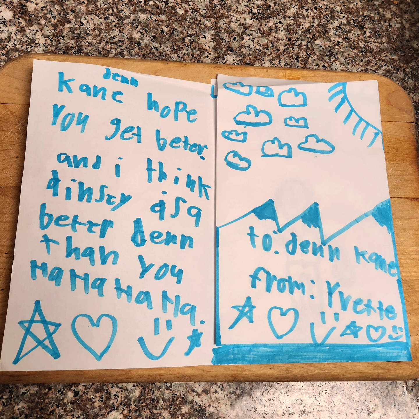 I also have several faculty who have small children who are my friends. I’ve talked about the Tiny Dean recently and showed the card she made me, today I have another to display, this one is a bit different. This little friend is very smart, but also very much a little wise-ass and I got this card delivered to me yesterday. Her mom told me she’s been very concerned about me and my surgery.